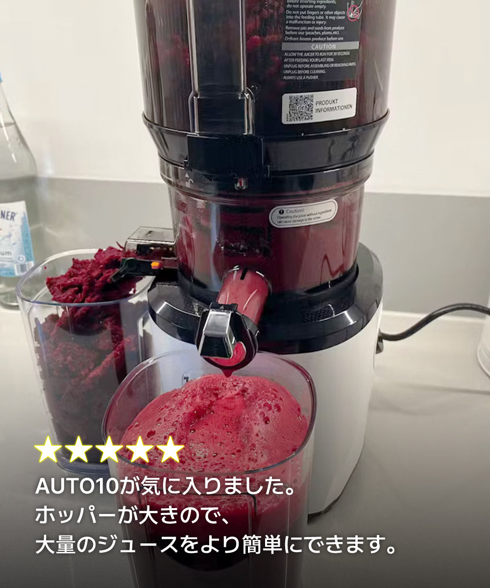 Kuvings ホールスロージューサーは、すべての材料を広い投入口に入れて、じっくり押して搾る石臼式で栄養素の損失を抑え、材料本来の味を引き出します。