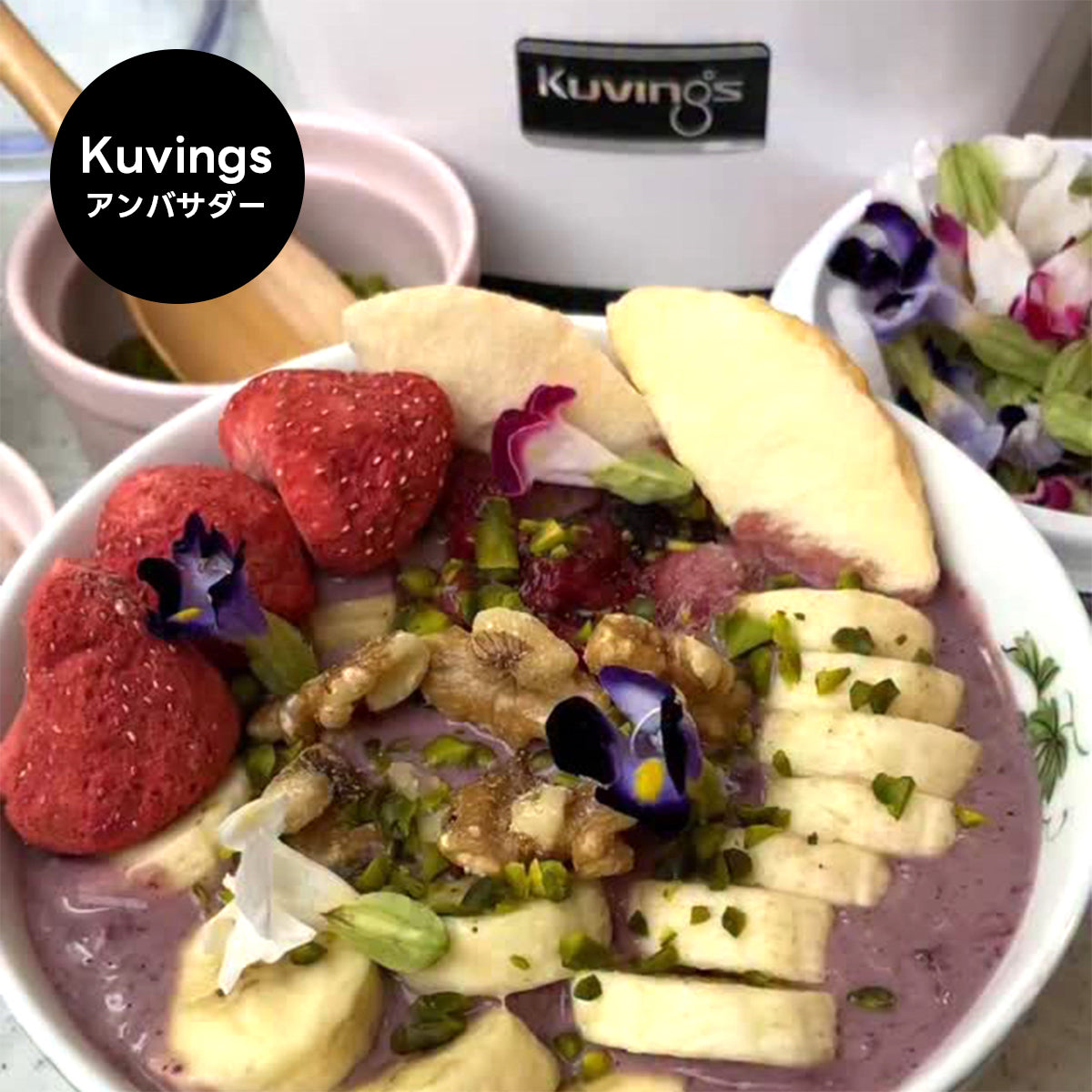 Kuvings ホールスロージューサーは、すべての材料を広い投入口に入れて、じっくり押して搾る石臼式で栄養素の損失を抑え、材料本来の味を引き出します。