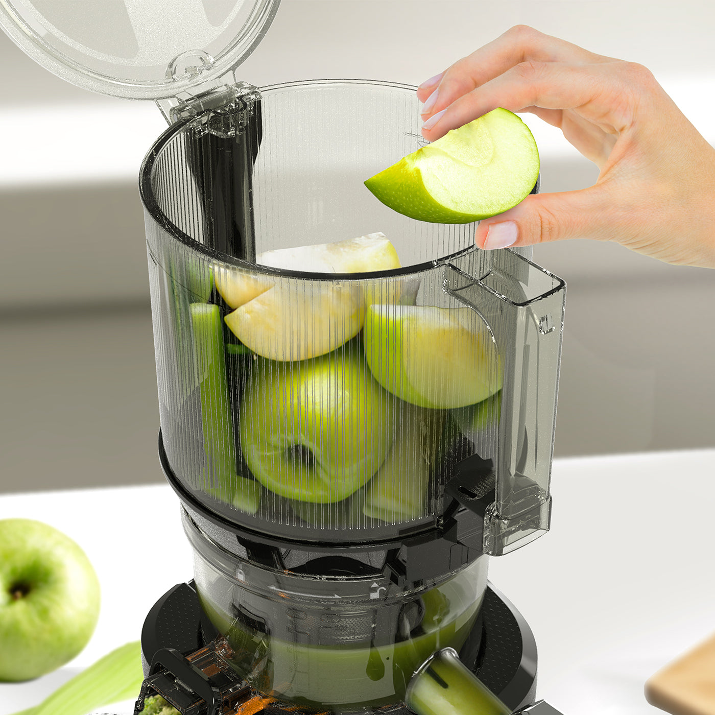 世界最大の3000ml容量の自動「オートホッパー」コンテナを使えば、大きな野菜や果物を切らずに完全に切り取ることができるので、貴重な準備時間を節約できます。