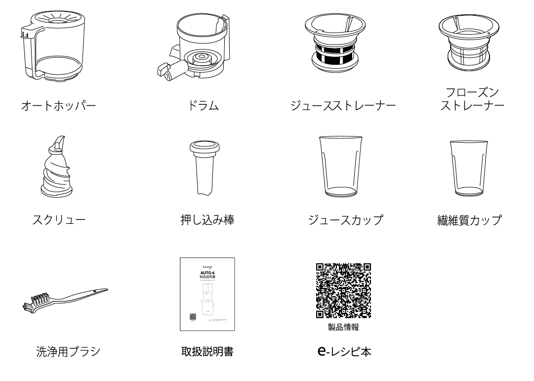 本体、ドラムセット、オートホッパー、押し込み棒、洗浄ブラシ、排出口洗浄ブラシ、分離型電源コード