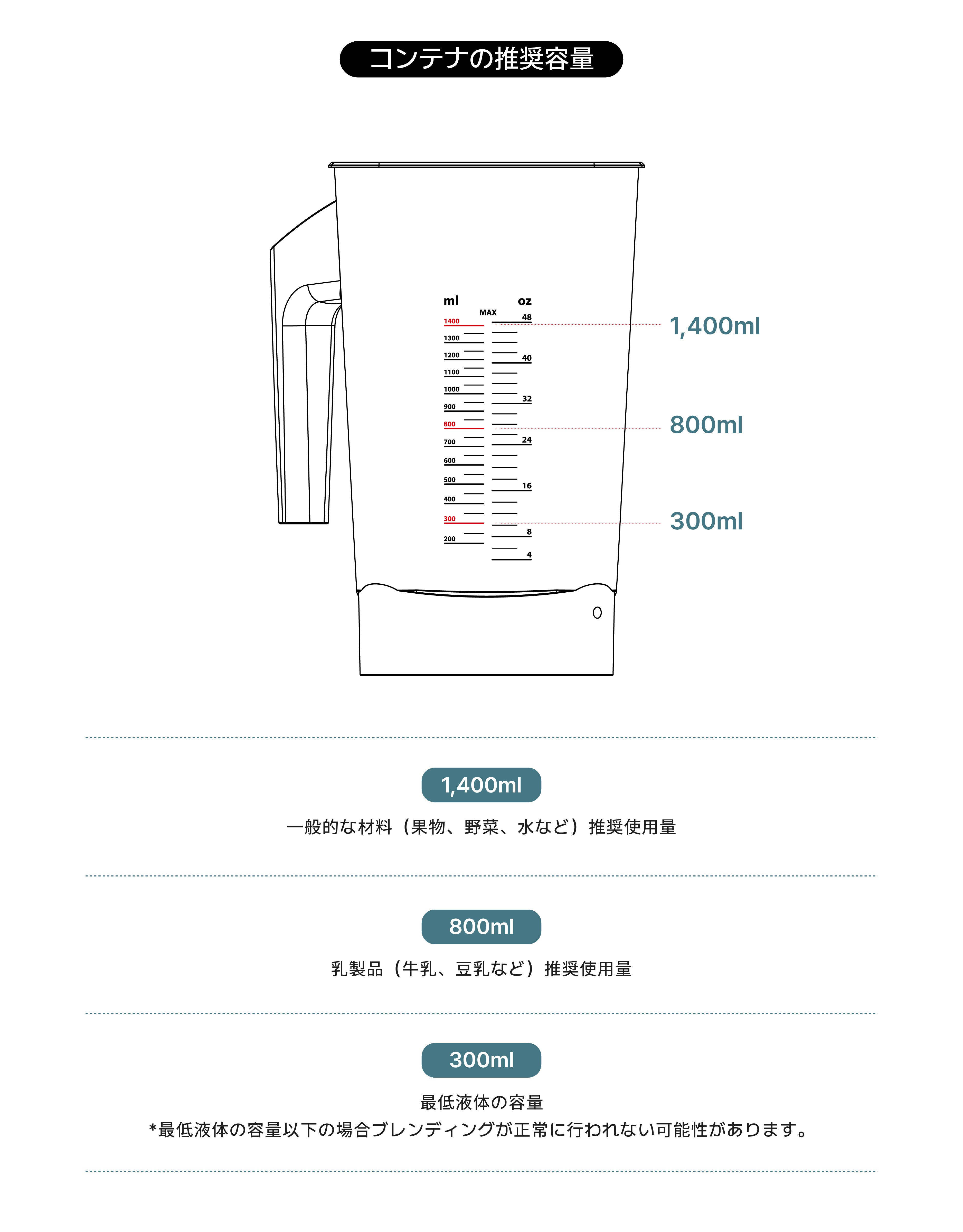 コンテナの下部が平らに設計され、内容物の跳ねを最小限に抑えため安定と均一なブレンディングが可能です。
