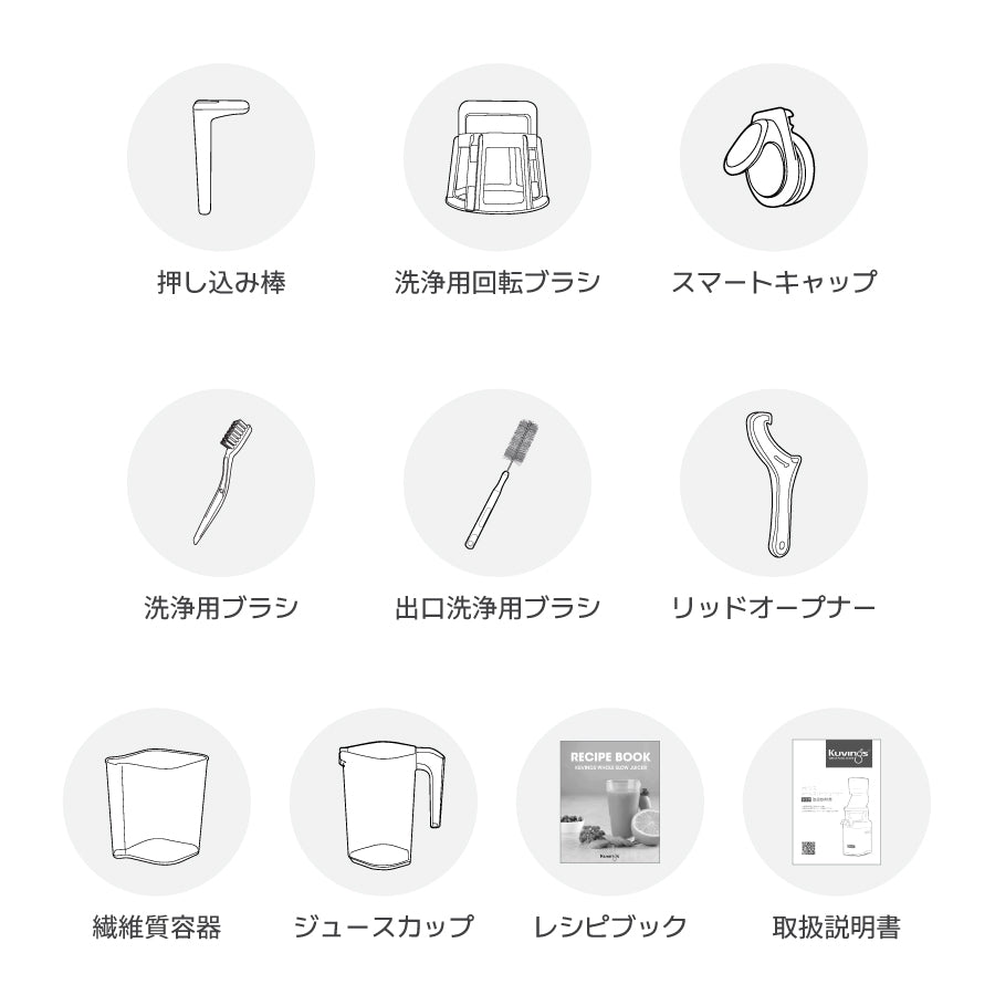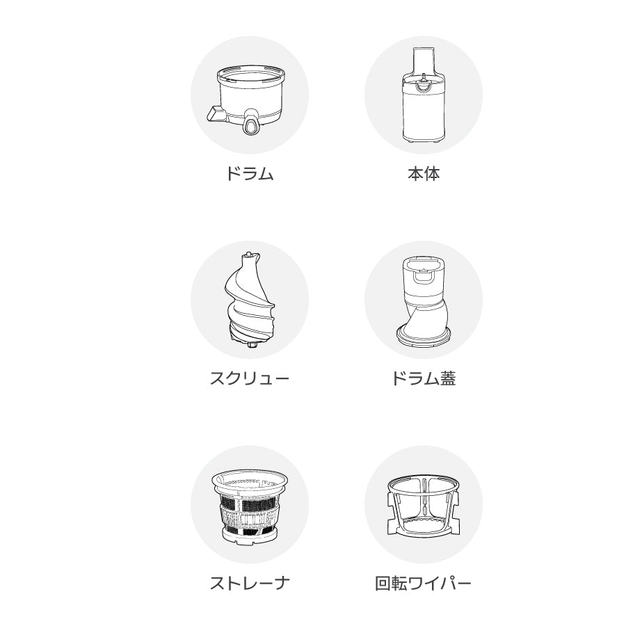 本体、ドラム蓋、ドラム、回転ワイパー、シリコンリング、ストレーナー、スクリュー、スマートキャップ、リードオープナー、押し込み棒、ジュースカップ、繊維質容器、洗浄用ブラシ、出口洗浄用ブラシ、洗浄用回転ブラシ、リードオープナー、レシピブック、取扱説明書