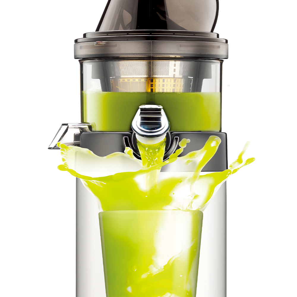 ゆっくりと回転する圧搾技術により、原料を効率的にコールドプレスし、100%天然ジュース、スムージー、ナッツミルクの最大限の栄養を搾汁します。