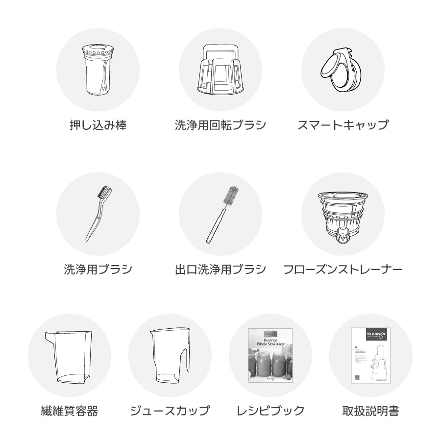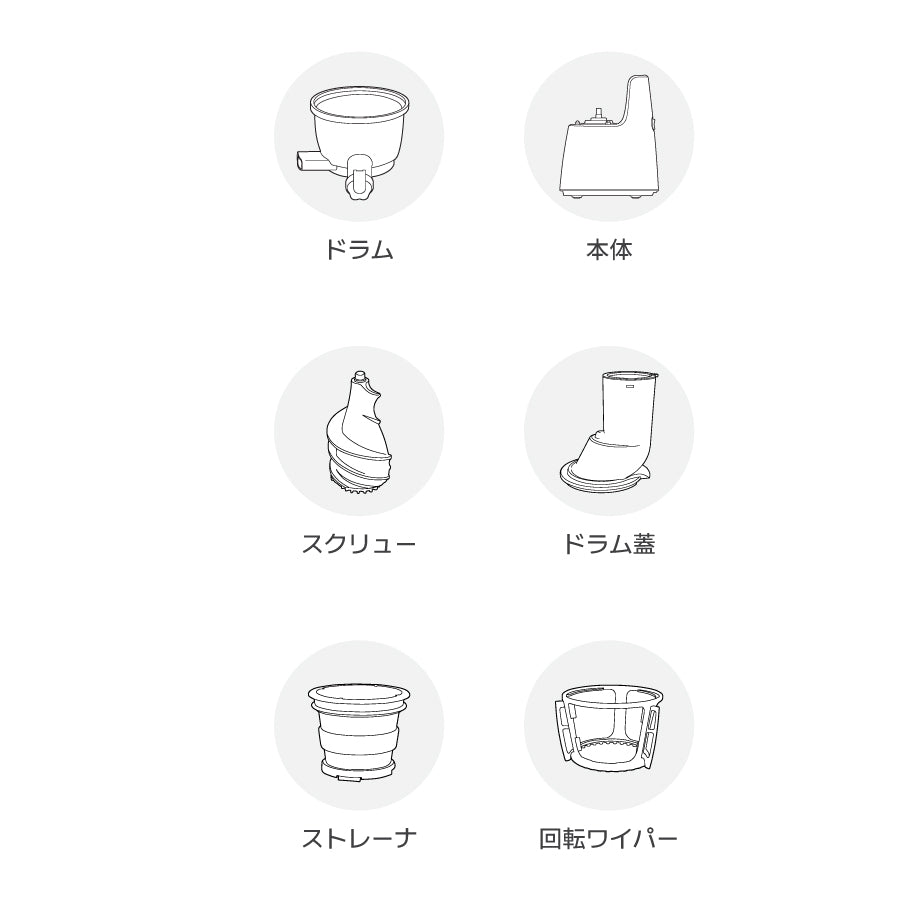 本体、ドラム蓋、ドラム、回転ワイパー、シリコンブラシ、シリコンリング、ストレーナー、フローズンデザートストレーナー、スクリュー、スマートキャップ、押し込み棒、ジュースカップ、繊維質容器、洗浄用ブラシ、出口洗浄用ブラシ、洗浄用回転ブラシ、レシピブック、取扱説明書