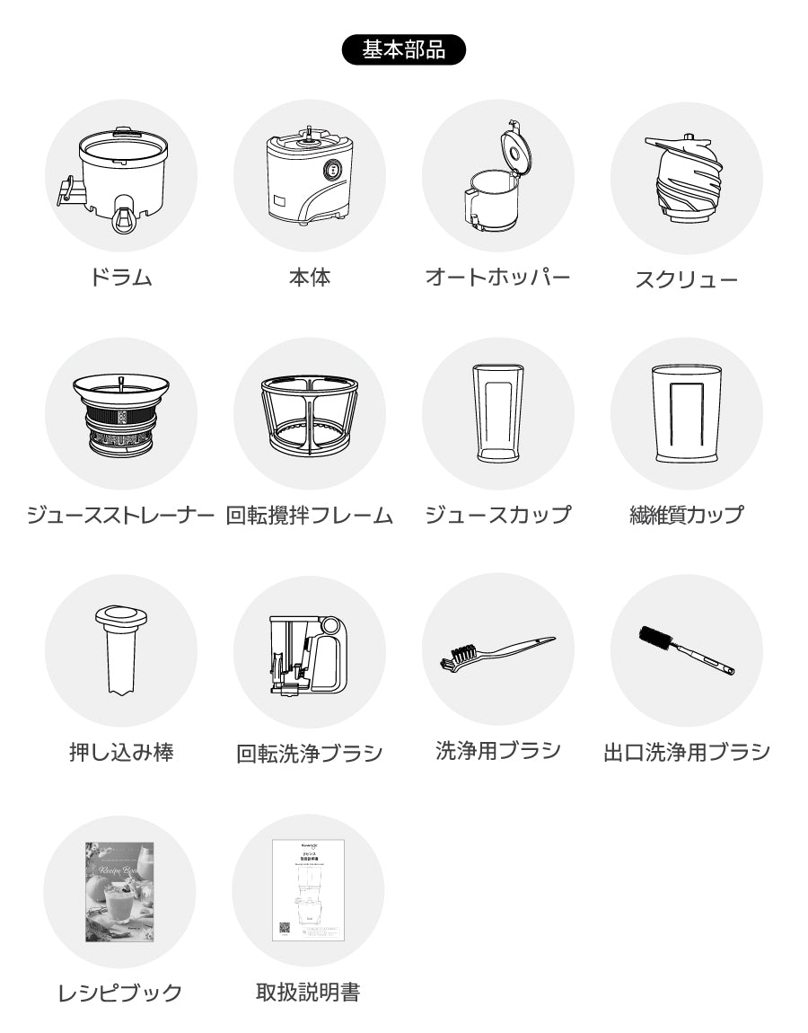 本体、ドラムセット、オートホッパー、押し込み棒、洗浄ブラシ、排出口洗浄ブラシ、分離型電源コード