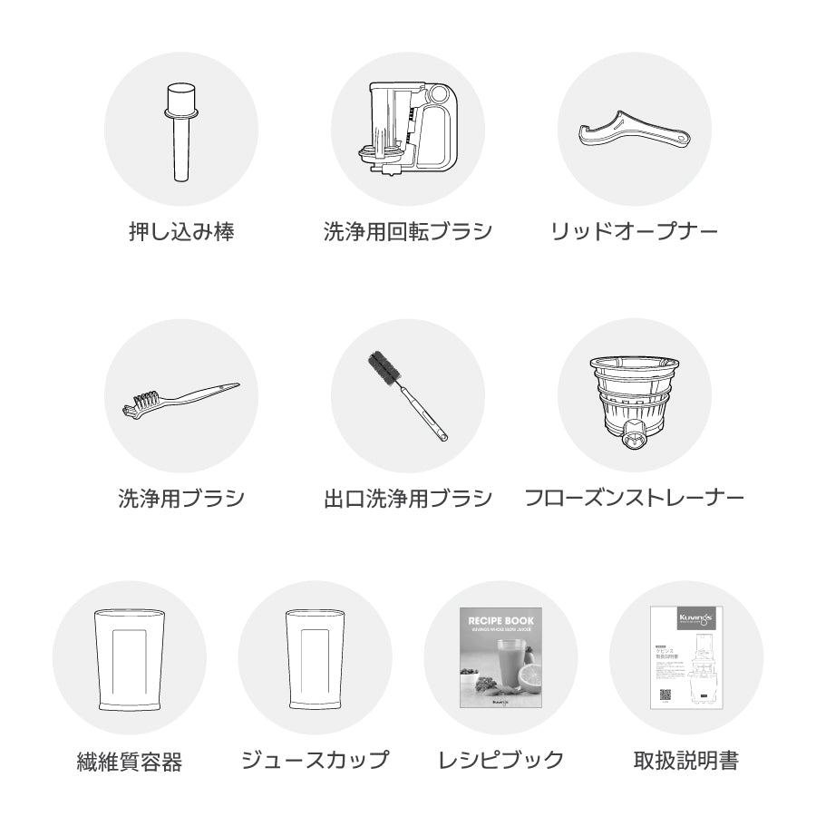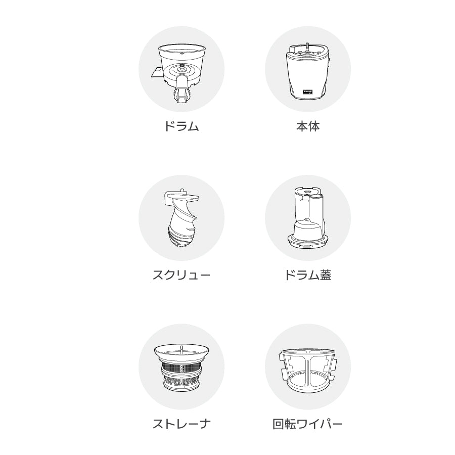 本体、ドラム蓋、ドラム、回転ワイパー、シリコンブラシ、シリコンリング、ストレーナー、フローズンストレーナー、スクリュー、スマートキャップ、押し込み棒、ジュースカップ、繊維質容器、洗浄用ブラシ、出口洗浄用ブラシ、洗浄用回転ブラシ、レシピブック、取扱説明書