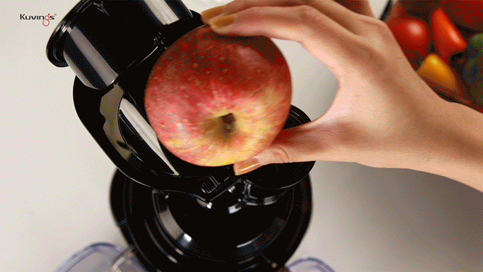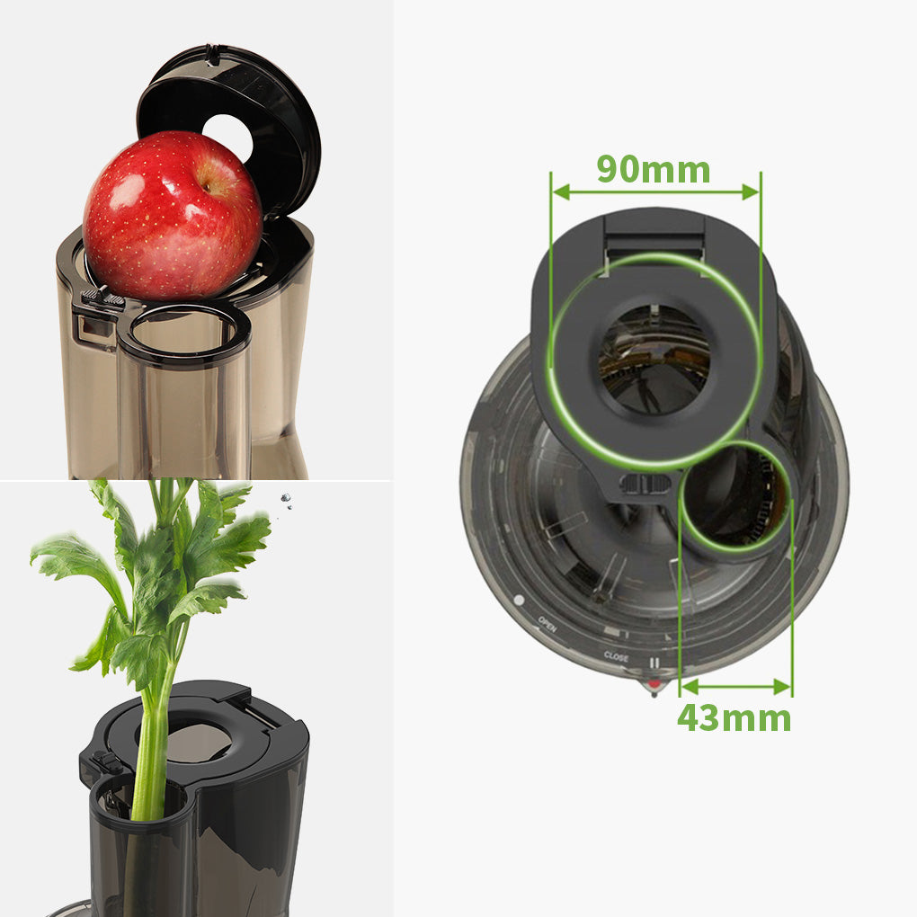 果肉の柔らかい果物を丸ごと投入できる90mmのフラップゲートに、葉菜類やニンジンなどの細長い食材をそのまま投入できる43mmのオートカット投入口をコラボさせた、クビンス独自の新しい投入口が生まれました。90mmのワイド投入口はフラップゲート式で、リンゴやオレンジ、ビーツのような食材を細かくカットする手間を省いて丸ごと投入することができるので、簡単に搾汁できます。